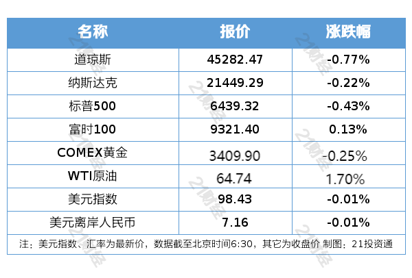 纽约股市三大股指8月25日下跌。截至当天收盘,道琼斯工业平均指数比前一交易日下跌349.27点,收于45282.47点,跌幅为0.77%;标准普尔500种股票指数下跌27.59点,收于6439.32点,跌幅为0.43%;纳斯达克综合指数下跌47.24点,收于21449.29点,跌幅为0.22%。